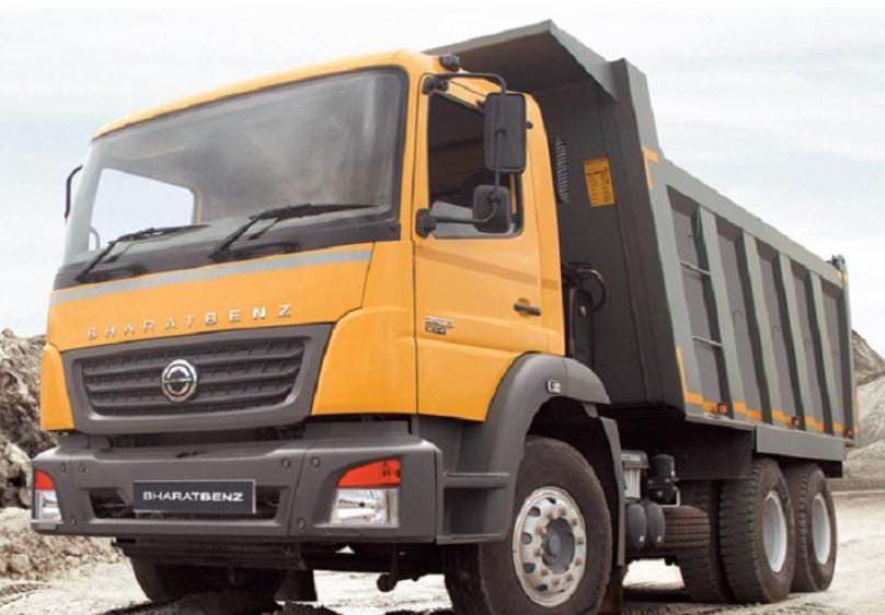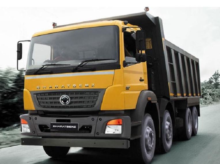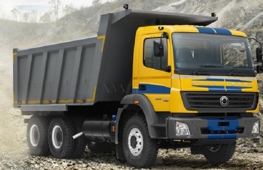 BharatBenz 3128C is the 8x4 axle tipper with 31 Ton GVW, powered by a 6373 cc DE210BS4diesel engine with SCR technology. This 12 tyre BharatBenz tipper produces a class-leading power of 281 HP and a max torque of 1120 Nm with 58% gradeability. The unique 6-cylinder engine, along with a 9-speed gearbox makes BharatBenz 3128C mileage as the best in class and coupled with a large 260 liters fuel tank, this makes BharatBenz 3128C tipper complete long duties without refueling. The tipper features provision for sleeping in a cabin with the hydraulic tiltable mechanism. The wide suspended sleeper cabin has parabolic leaf springs underneath in front with telescopic shock absorbers, giving the best in class driver comfort and tandem bogie in the rear. BharatBenz 3128C price starts from Rs 42.1 Lacs ex-showroom.